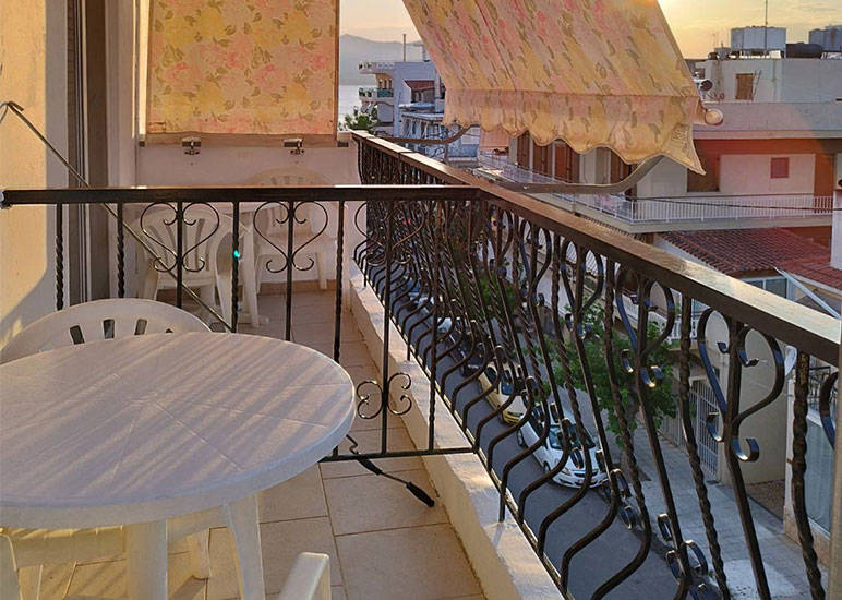 Both the 8 double rooms and the 3 two-room – four-bed rooms have a facade on Miaouli, are airy and bright and have spacious verandas with a partial view of the sea.